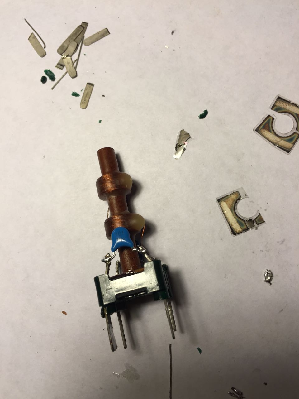 IF Can after rebuild.  The thin sheets on the right are the mica film capacitors where the silver migrates toward the center and creates a short between the primary and secondary windings.  The little metal tabs in the upper left are what connects to the mica sheet and need to be removed, then the new 100pf capacitor (blue thing) is soldered in to replace the removed mica cap.  it is all epoxied back together and placed back into the metal can and finally placed back into the radio.